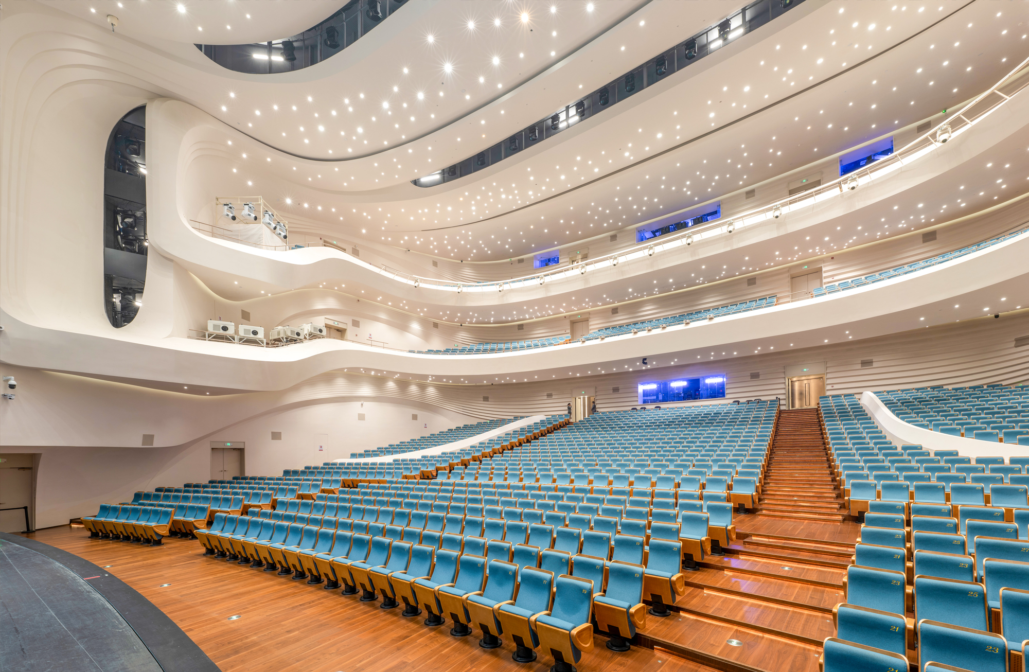 歌剧院照明系统由天花筒灯以及灯带照明系统组合而成。照明设计精心将PLANA PRO 以及 VOLTA系列不同功率的筒灯进行排布组合,InvisiLED NEON系列整体以智能控制系统,形成不同氛围的照明效果以配合如观众入场、暖场、演出、散场等不同模式选择。