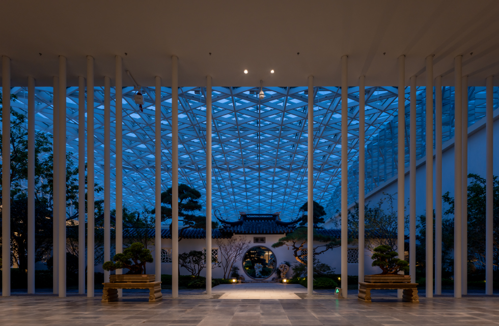 西园外围,MINI FLOOD IV 线条灯均匀打亮立柱,垂直光线沿立柱纵向延伸,多根立柱的光影呈现明暗交错的层次感,与中式写意的苏园形成呼应,东西并茂。