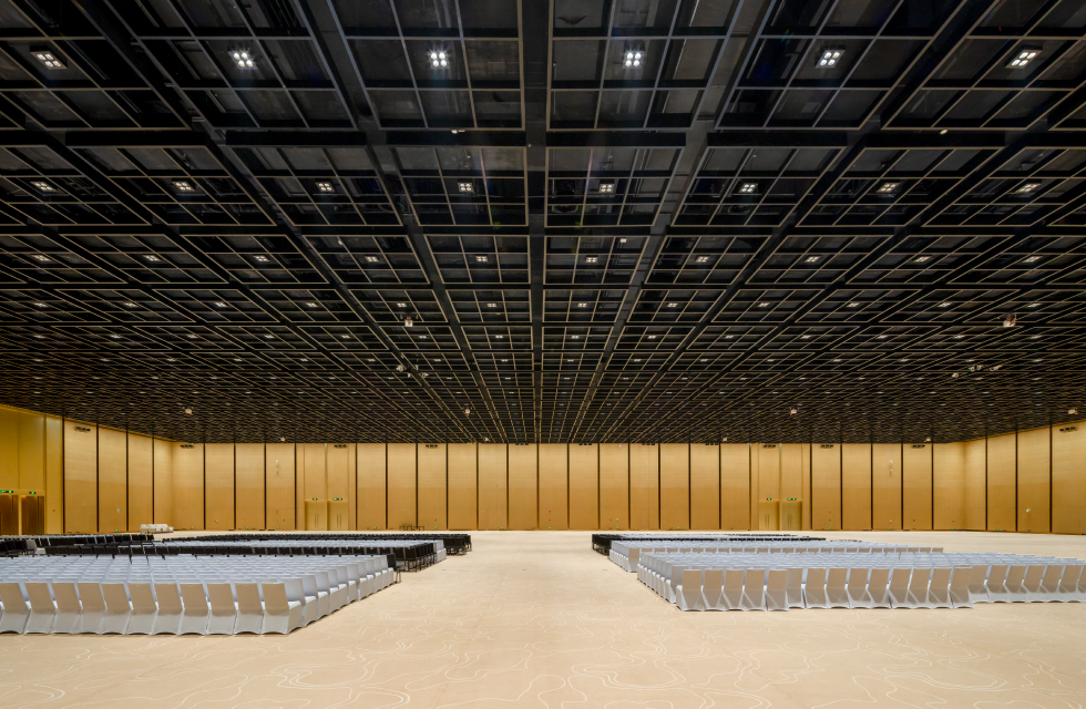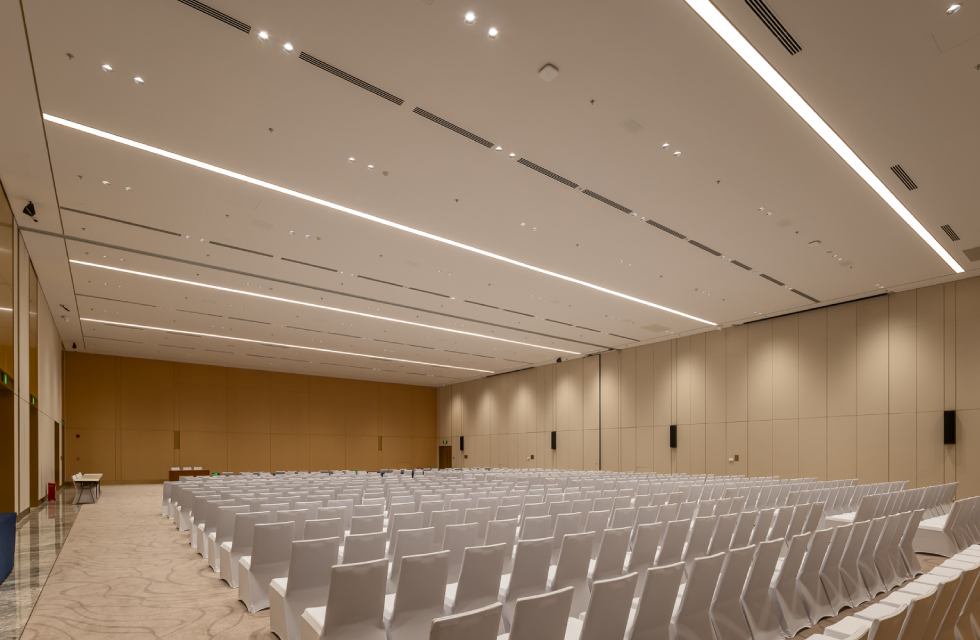 主会厅长105米,宽70米,总面积近 7500平方米,高度近12米,超高挑高和超大空间尺度对基础照明的充足性、均匀性有着严苛要求,针对这一需求,WAC 巧妙地将4款 VOLTA 筒灯统一嵌装在同一箱体内,确保光线充足、覆盖范围精准,满足超高空间的基础照明需求,同时,箱体整合设计有效规避了单灯分散安装可能造成的天花杂乱,保持整体空间的简洁统一。