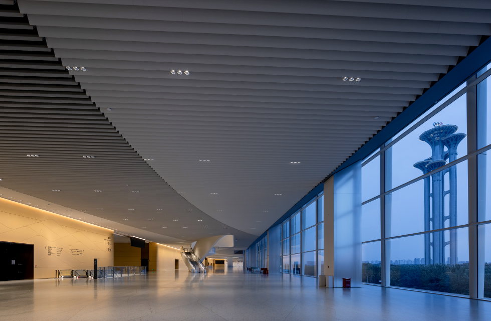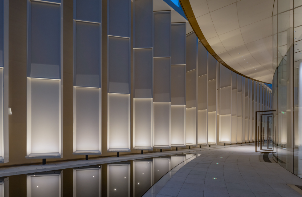 序厅为贯通三层、连续通高的宽阔走廊,呼应整体建筑“开放”的设计理念,独特的“鸟窗”设计与外立面玻璃巧妙引入自然光线,让室内外光影自然交融。为适配序厅天花格栅的结构要求,WAC 定制专属支架, 实现 PLANA PRO 系列下照及洗墙筒灯的创新式安装,该方案既满足了序厅的基础照明需求,又以均匀的光线铺满墙面,使得整个空间开阔通透、温馨自然。