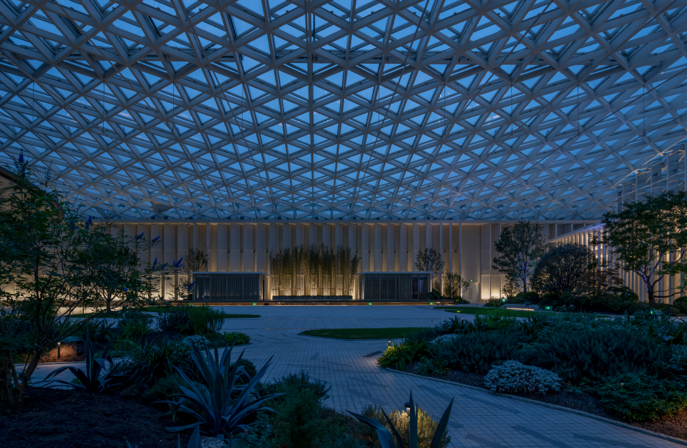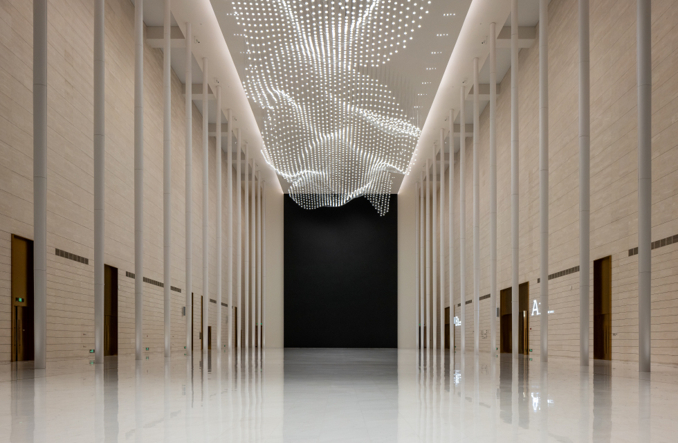迎宾握手厅两侧立面高达26米, VOLTA 系列筒灯均匀嵌入顶部天花板,规整的布局强化了空间秩序,高光效为整个空间营造明亮通透的氛围。天花顶部特别选用 FALCON 轨道灯系列中不同光束角的洗墙灯与射灯,满足了洗墙、泛光、窄光等多种照明需求,灯具沿天花连续排布,自然衔接无断层,以光线串联起空间中的每一处细节。