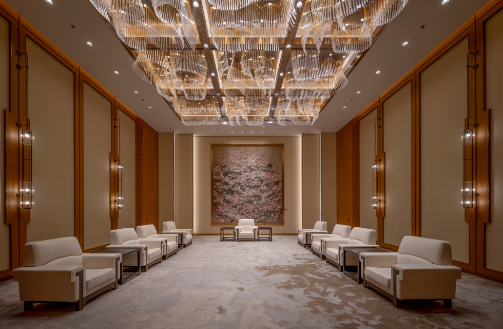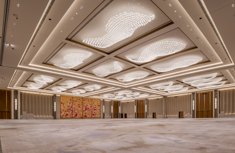 峰会厅以空间中心为原点,筒灯向外圈逐次散开,天花灯带巧妙排布,精准呈现“天圆地方”的设计形态。宴会厅采用 VOLTA 筒灯确保整体空间光线充足,再将灯带融入天花,为宴会厅打造雅致格调。