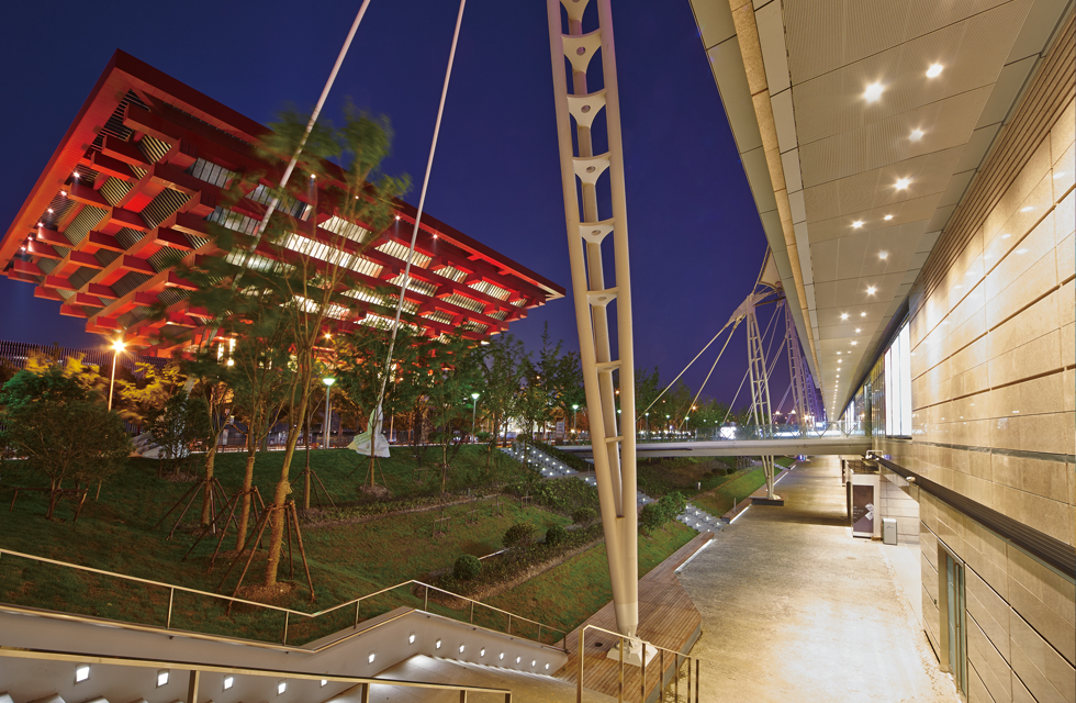在世博源购物中心建筑外公共廊道不同的店面设计风格迥异,个性彰显。廊道内的公共照明需要糅合店面之间的光影冲突和凌乱的表达,要为公共空间提供舒适宜的光环境,更要勾勒出建筑的整体外部造型。