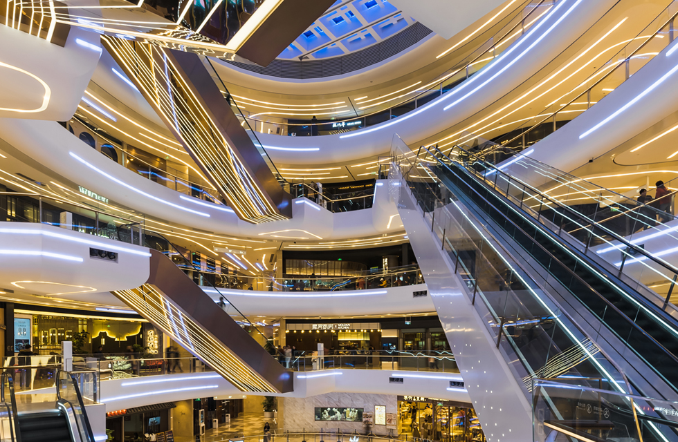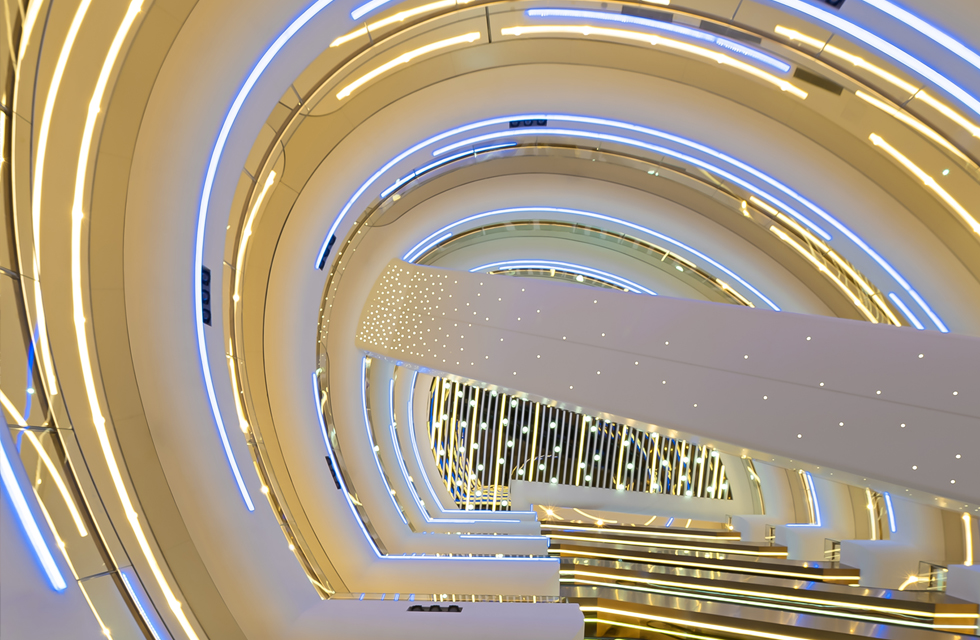 整个商场以“都市银河”为设计概念,从中庭、穹顶、扶梯包装上都可以看出银河星空等元素。随扶手楼梯缓缓而上,星空银河尽在眼前,仿若手可摘星辰, 漫步其中,自在随性、享受静谧。