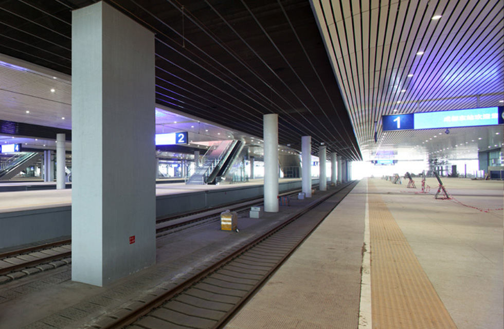成都东站站场占地约1306亩,车站南北长2.9公里,东西宽520米,站区自西向东划分为西广场、车站和东广场三部分。车站建筑总面积约22万平方米,包括站房、无柱雨棚和高架道路平台等。