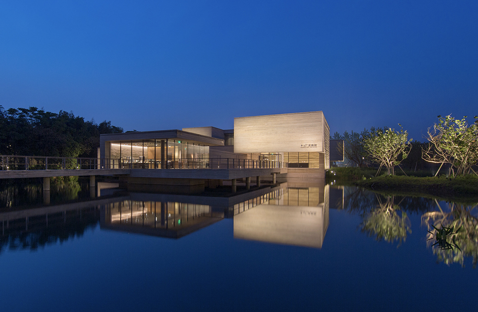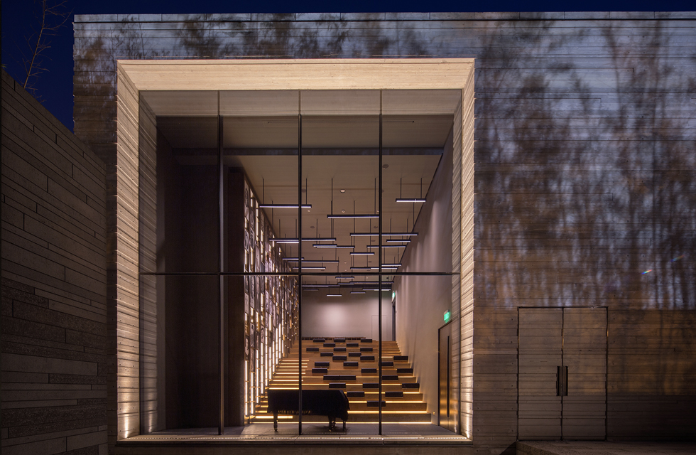 与木心心仪的简约美学相契合,全馆由三五方现代几何造型起伏衔接,以横向的不规则表层和均匀的清水混凝土铸造的外立面配以 WAC Lighting GRAZE 系列灯具洗墙,灯具悬架于外墙下部,均匀柔和的灯光掠射将建筑外立面清水混凝土的本色立体而完美展现。