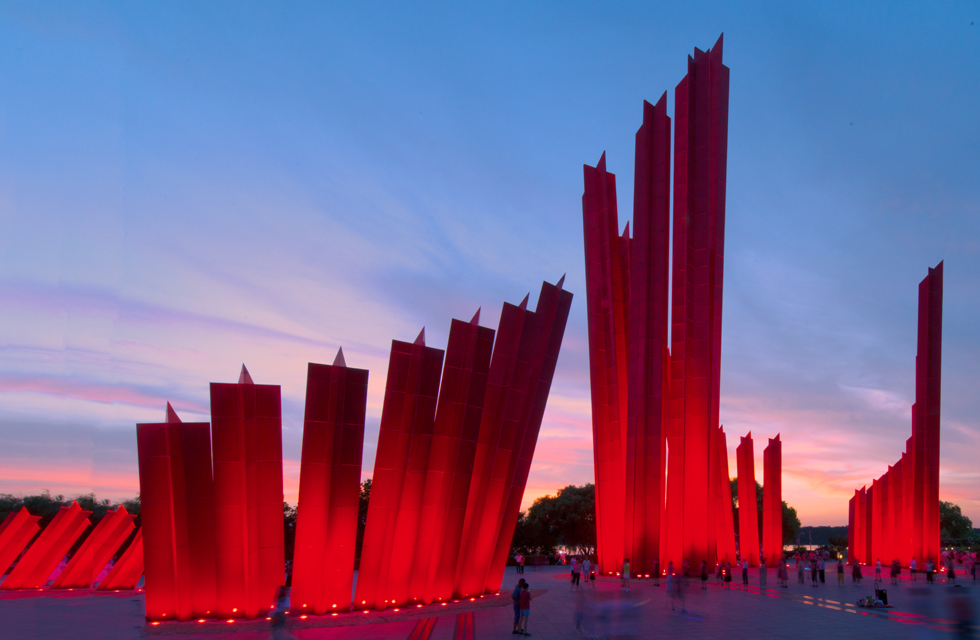49颗红色五角星连同49根大型红色立柱在江边闪耀,犹如灯塔一般指引着革命者奋勇向前,又似连天烽火,让人们追忆起70年前那段峥嵘岁月,追忆起百万雄师过大江的雄风与豪情